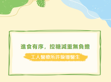 許璇珊建議用餐時調整「進食順序」,是控糖減重的關鍵,核心原則為「先菜後肉再澱粉」;蔬菜纖維可延緩胃排空,減低醣類吸收,能延緩血糖上升、減少胰島素分泌及體脂肪的生成;肉類可選擇白肉如去皮雞肉、魚肉、豆類等,延長食物消化時間,提高飽足感;澱粉如米飯屬於碳水化合物,於蔬菜及肉類之後食用,達到類似「天然控糖減重」的效果,同時有效降低血糖峰值及脂肪的囤積。